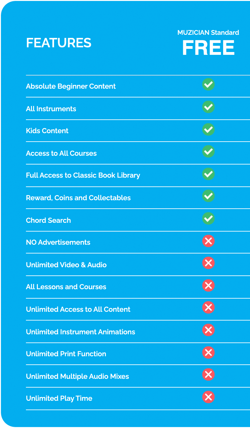 Everyone who signs up to a Muzician FREE account receives a Standard Membership. The list below gives a basic outline of all of the great content a Standard Member is able to access, with no time limit, or payment details required.