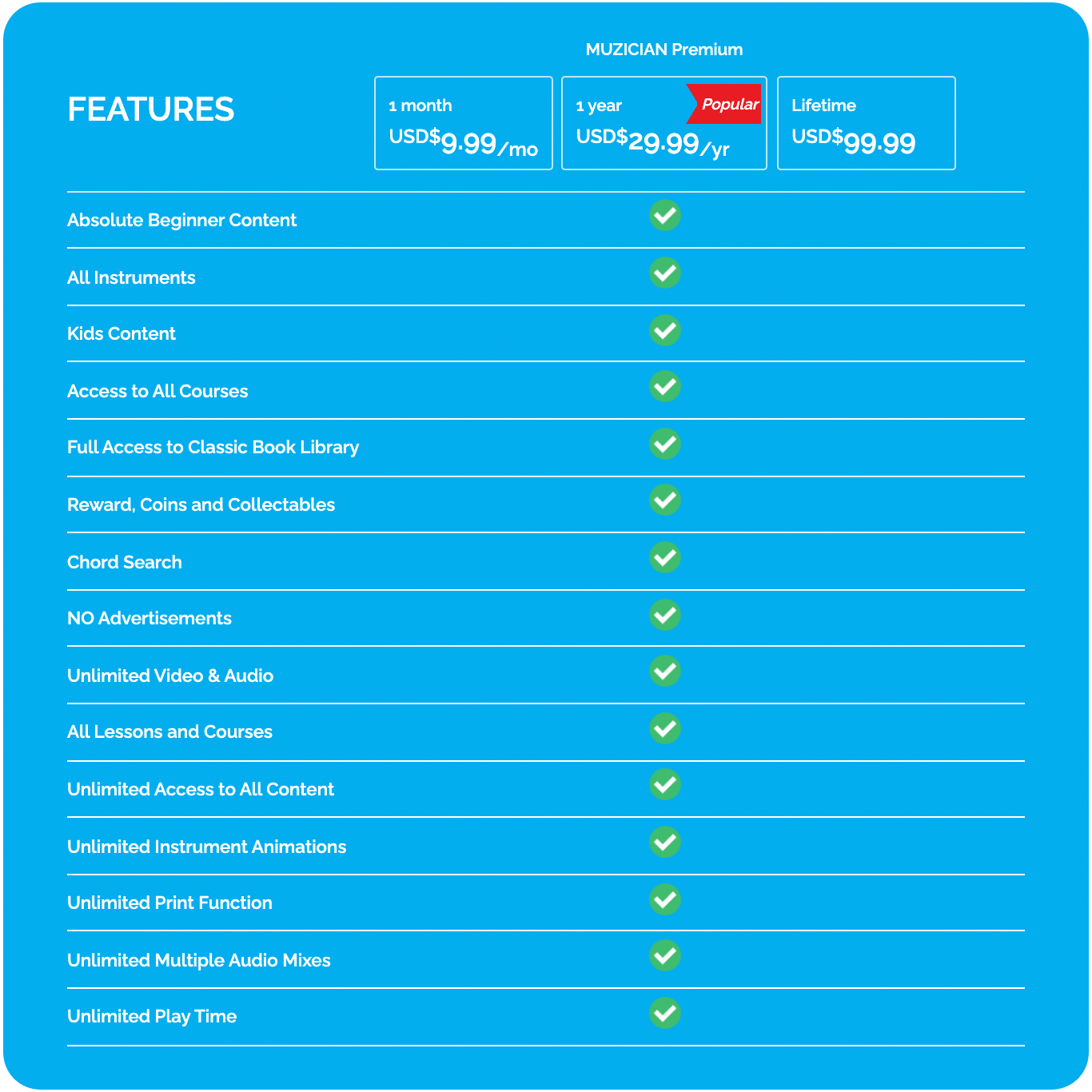 Premium Membership unlocks ALL of the content Muzican has to offer, as outlined below.